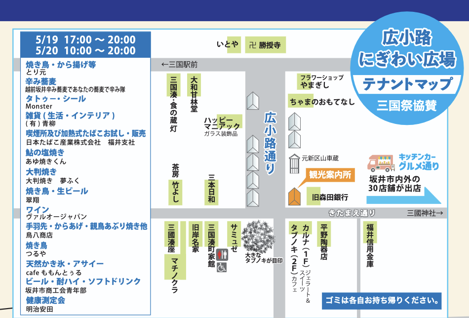 令和8年 広小路にぎわい広場キッチンカーグルメ通り 三国祭期間中は旧森田銀行付近もぜひ訪れたいスポット! 5月19日夕方から20日に開催される「にぎわい広場」は旧森田銀行横の通称「広小路」で行われます! 三国町内外のお店が多数出店しており、美味しい味覚やモノを楽しめますよ! また当日はグルメ通りにキッチンカーが30数台出店!!お楽しみに!!